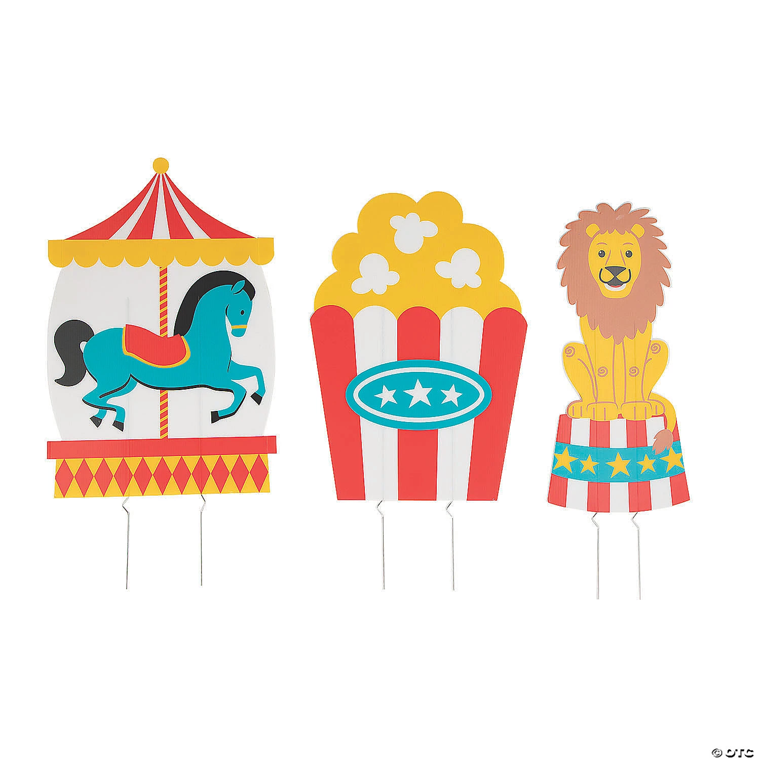 Step right up for some colorful yard signs featuring carnival images! Perfect for displaying outside a carnival-themed birthday party or for a community carnival at a school or church, these signs will help visitors figure out where the gathering is taking place. This set of signs includes images of a carousel horse, a popcorn tub and a lion. Corrugated plastic. (3 pcs. per unit) 10 3/4″ – 16″ x 23″ – 24″ with 22″ metal stakes. Simple assembly required. © OTC