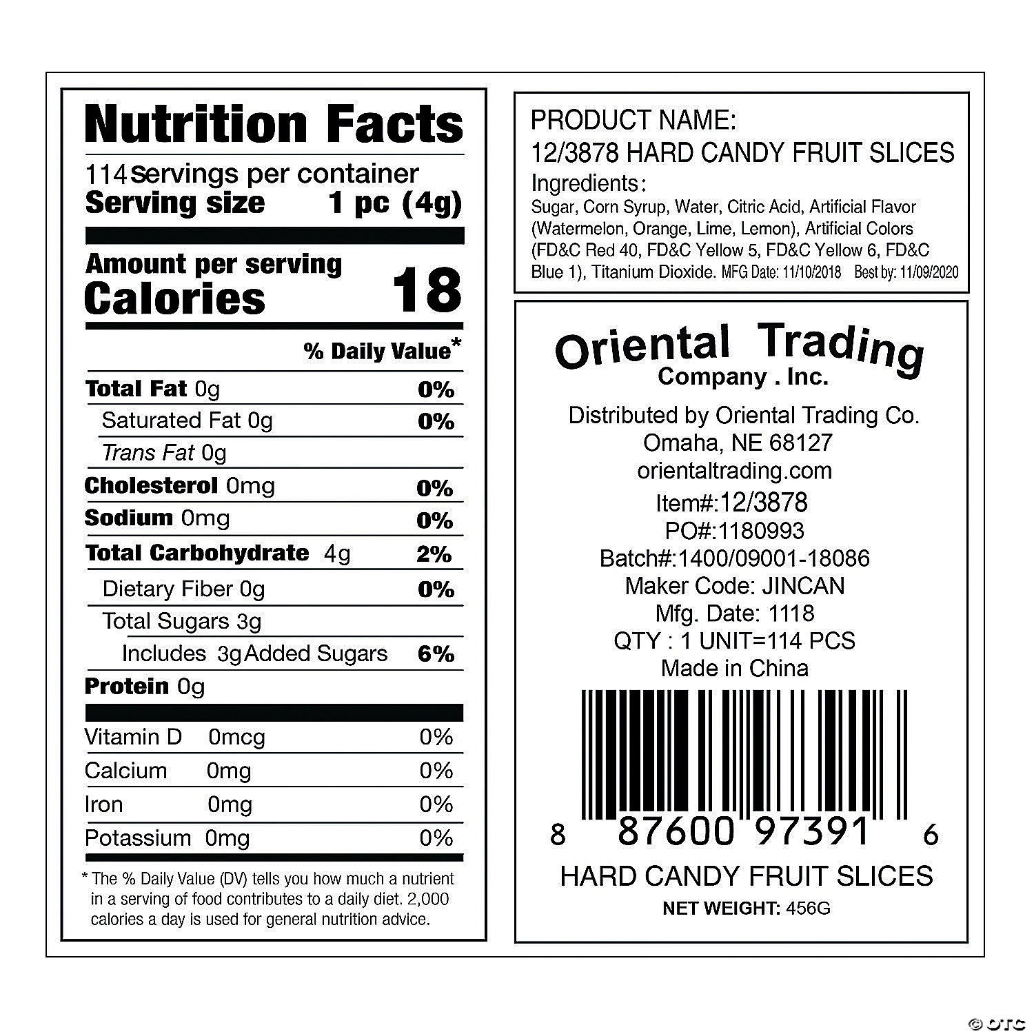 Hard Candy Fruit Slices. It tastes just like the fruit! Unwrap the fun during summer picnics, parties and more. These little candies make sweet appetizers or after-dinner treats and are sure to create a multitude of smiles. Includes watermelon, lime, lemon and orange-flavored pieces. Individually wrapped. (Approx. 114 pcs. per unit) Total weight, 1 lb. Candy is non-returnable. For more information, visit our “Return Policy” page located on our website. Fat Free. © OTC