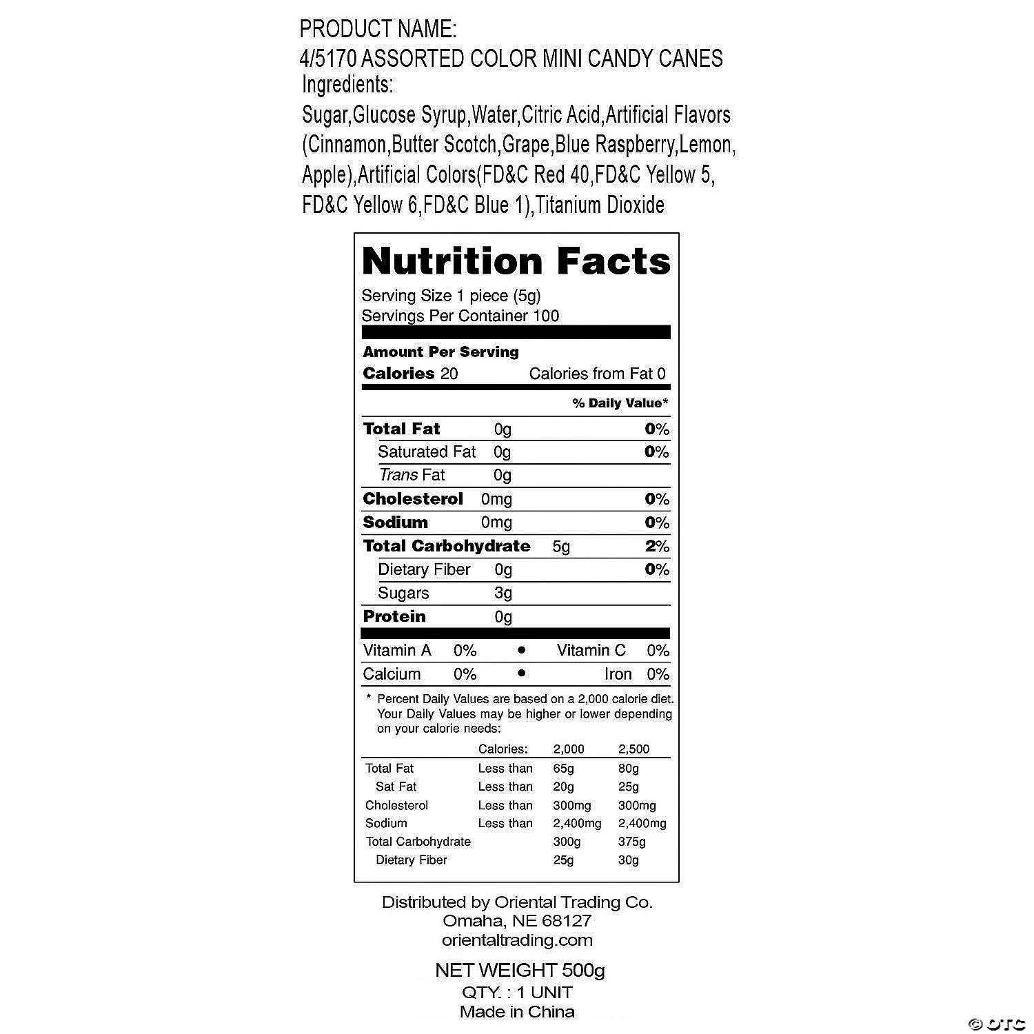 Mini Candy Canes in assorted colors and flavors. Can’t palette peppermint? Try these Mini Candy Canes that come in cinnamon, butterscotch, grape, blue raspberry, lemon and sour apple flavors. Individually wrapped. (100 pcs. per unit) 2 1/2″ Fat-free. Total wt., 1 lb. 1 oz. Candy is non-returnable. For more information, visit our “Return Policy” page located on our website. © OTC