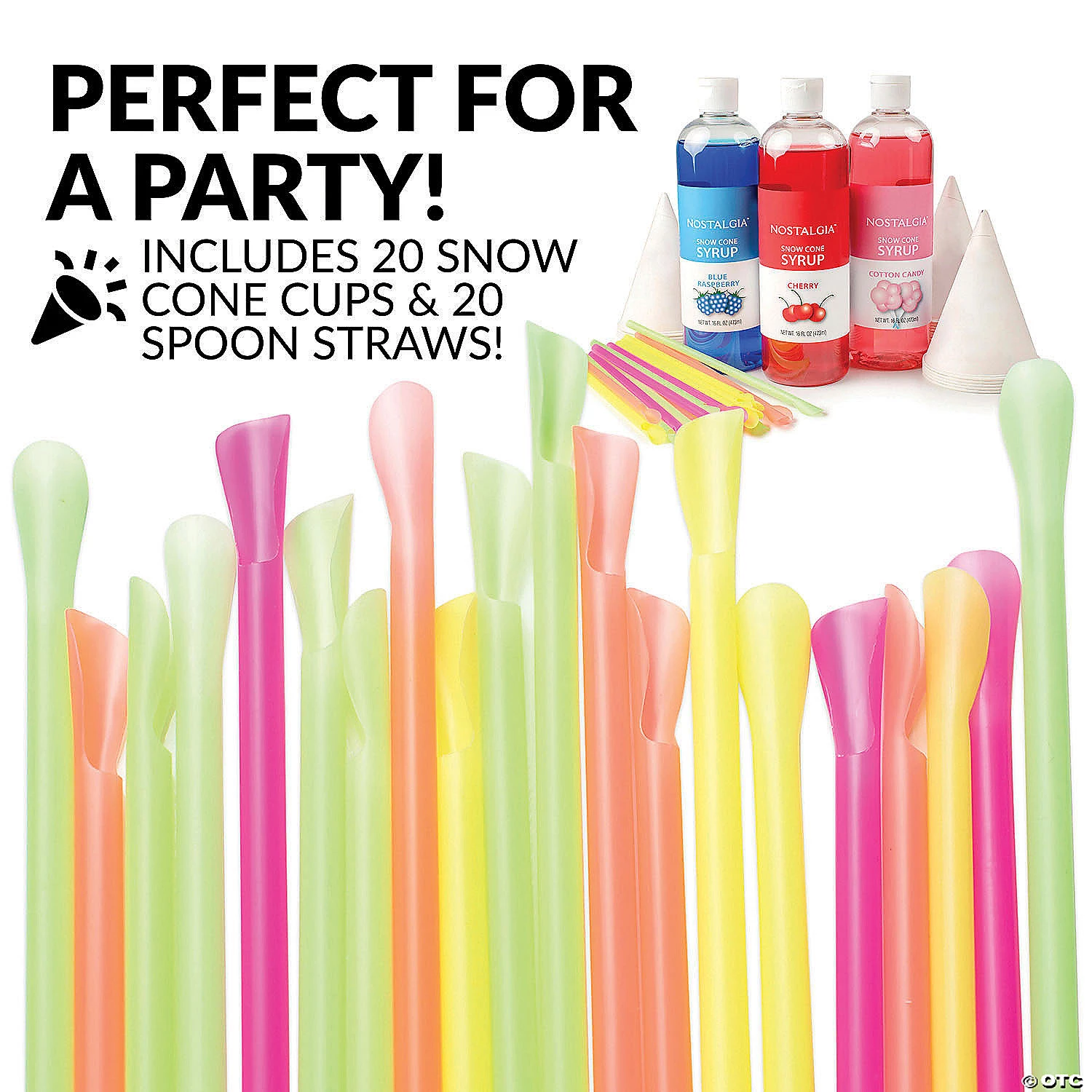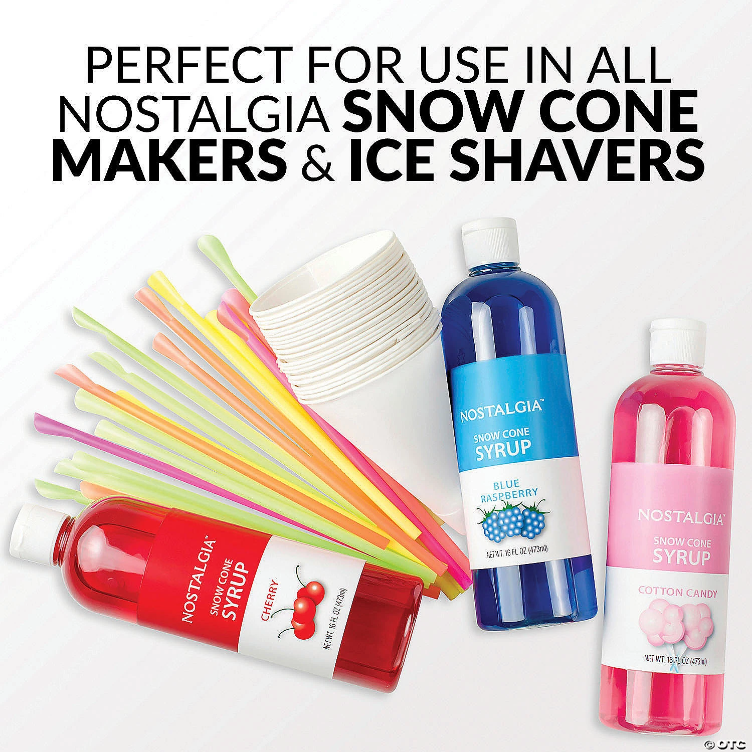The perfect addition to any Nostalgia snow cone or shaved ice maker! Just add freshly shaved ice to a snow cone cup and pair with your favorite snow cone syrup for a delightfully icy treat. Mix and match flavors for even more fun!COMPLETE PARTY KIT – With this kit there’s no need to pack up and head to the carnival! At your next party, serve delicious and icy snow cones with the snow cone cups, spoon-straws and syrups included20 SNOW CONES – Perfect for everything from birthday parties to pool parties, you can supply up to 30 guests with a timeless and refreshing snow cone treatBLUE RASPBERRY – Kit includes a 16 oz. easy-pour bottle of Blue Raspberry SyrupCHERRY – Kit includes a 16 oz. easy-pour bottle of Cherry SyrupCOTTON CANDY – Kit includes a 16 oz. easy-pour bottle of Cotton Candy SyrupALSO INCLUDED – Fill 20 snow cone cups with shaved ice and syrup, then use the included 20 spoon-straws to enjoy your snow coneNOSTALGIA SNOW CONE MAKERS – Kit is perfect for use with any Nostalgia ice shaver, slush maker, or snow cone maker!MADE IN THE USASpecial Shipping Information: This item ships separately from other items in your order. This item cannot ship to a P.O. Box. This item may be subject to additional processing days. ITEM IS NOT ELIGIBLE FOR EXPEDITED SHIPPING
