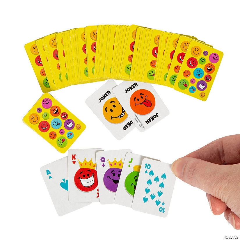 Have fun playing with these tiny 1 1/2″ cards! Deal out a hand of smiling faces at your next card game or hand these playing cards out as unique birthday party favors. Compact and fun for travel, these cards will become kids’ favorites. Searching for more fun? You’ll find even more playing cards in an array of silly styles on our site. (54 cards per deck) © OTC