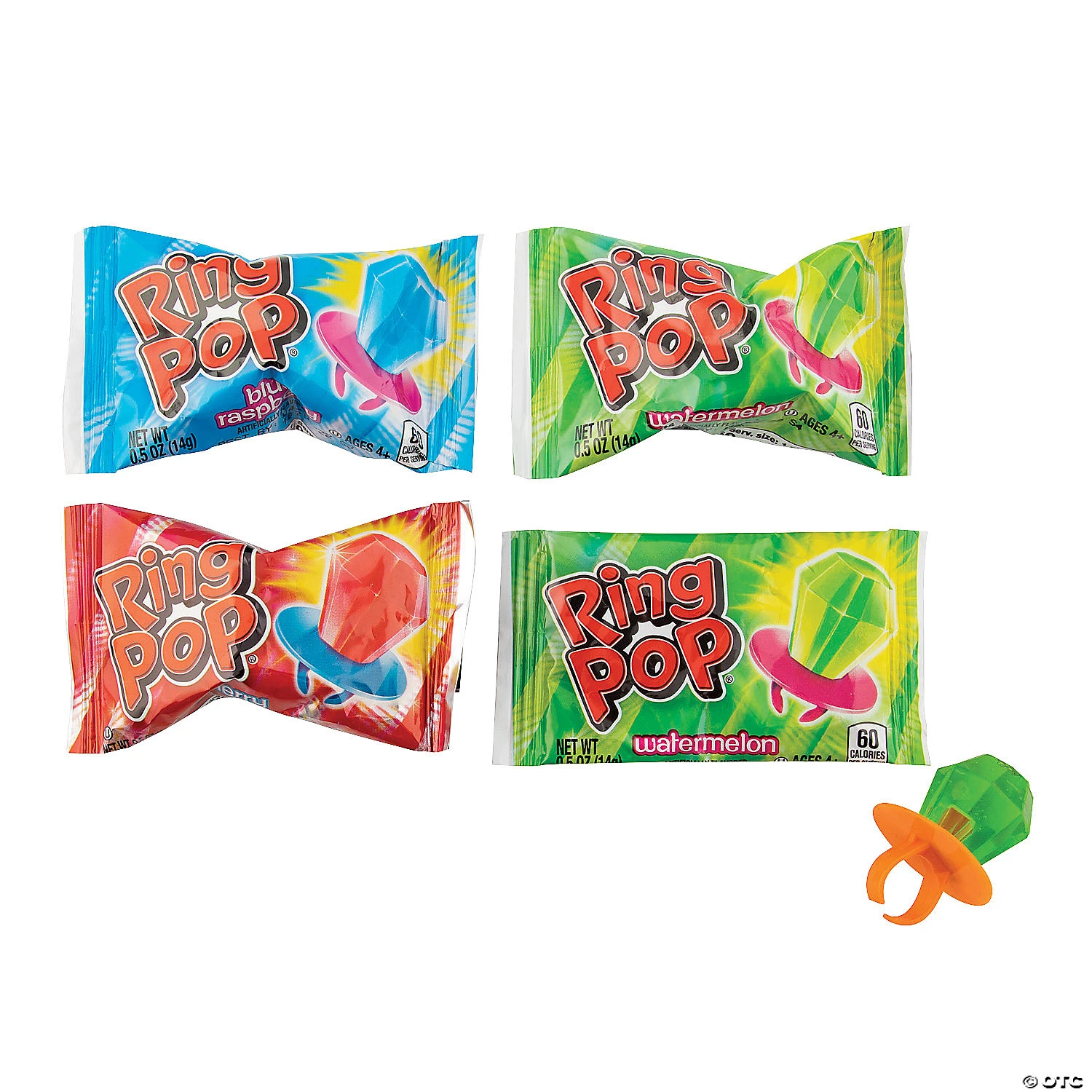 Get your hands on this limited edition mix of Topps Ring Pops® featuring original flavors, sour flavors and fun “twisted” flavor combinations. At only 60 calories per serving, these iconic candies come in a sturdy plastic container that is perfect for the classroom or for handing out to kids as giveaways or prizes. Assorted flavors. Individually wrapped. (50 pcs. per unit) Total wt., 20 oz. Dairy-free. Gluten-free. Kosher. Nut-free.• Made in the USA, Important Country of Origin Information: For certain items sold by Oriental Trading on our Web or Mobile sites, country of origin information can change and what is displayed may not be accurate or consistent with manufacturer information. For up to date country of origin information, it is recommended that you rely on product packaging or other manufacturer information.• Ingredient, nutrition, allergen and other product information are provided on our Web and Mobile sites for reference purpose only, without warranty or representation as to accuracy. Manufacturers adjust their labeling regularly and are solely responsible for the accuracy of the information. For general questions concerning these items, please contact our customer service at 800-228-0475.